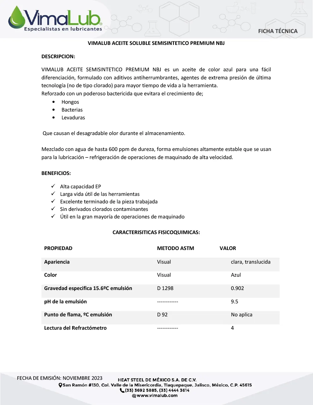 Aceite Soluble Semisintético NBJ de VimaLub especialmente formulado para procesos de mecanizado que requieren una emulsión estable y una mayor resistencia microbiana. Este producto combina lo mejor de ambos mundos, ofreciendo excelente lubricación, refrigeración y protección contra el desgaste y la corrosión. Su fórmula avanzada reduce la proliferación de bacterias y hongos, prolongando la vida útil del fluido y mejorando la limpieza de la maquinaria. Ideal para aplicaciones en la industria automotriz, metalmecánica y manufacturera que demandan un rendimiento superior al semisintético tradicional.