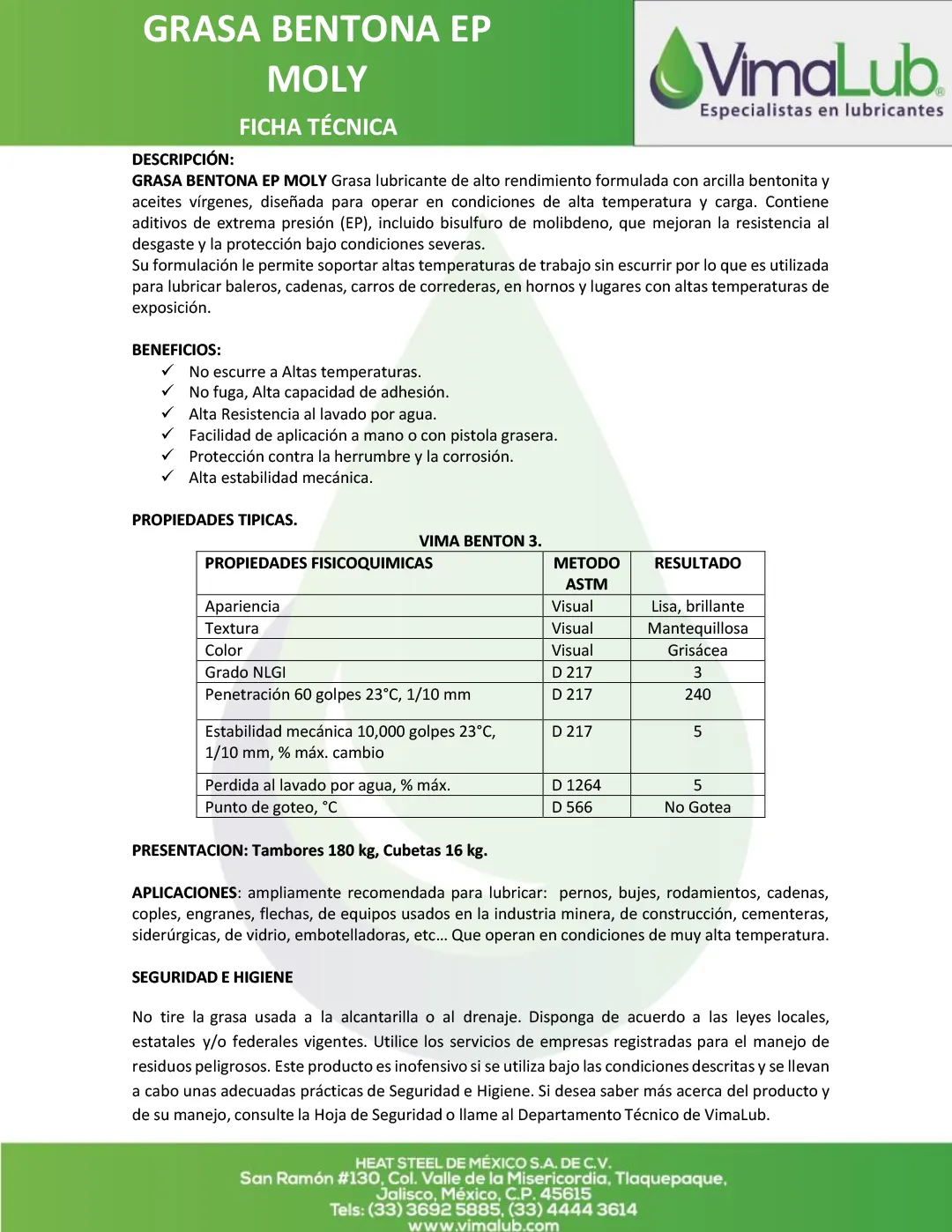 Grasa Sintética Bentona EP Moly VimaLub de alto rendimiento especialmente formulada con aditivos EP (Extreme Pressure) y enriquecida con bisulfuro de molibdeno (MoS₂) para ofrecer una protección superior contra el desgaste y la presión en aplicaciones industriales exigentes.
