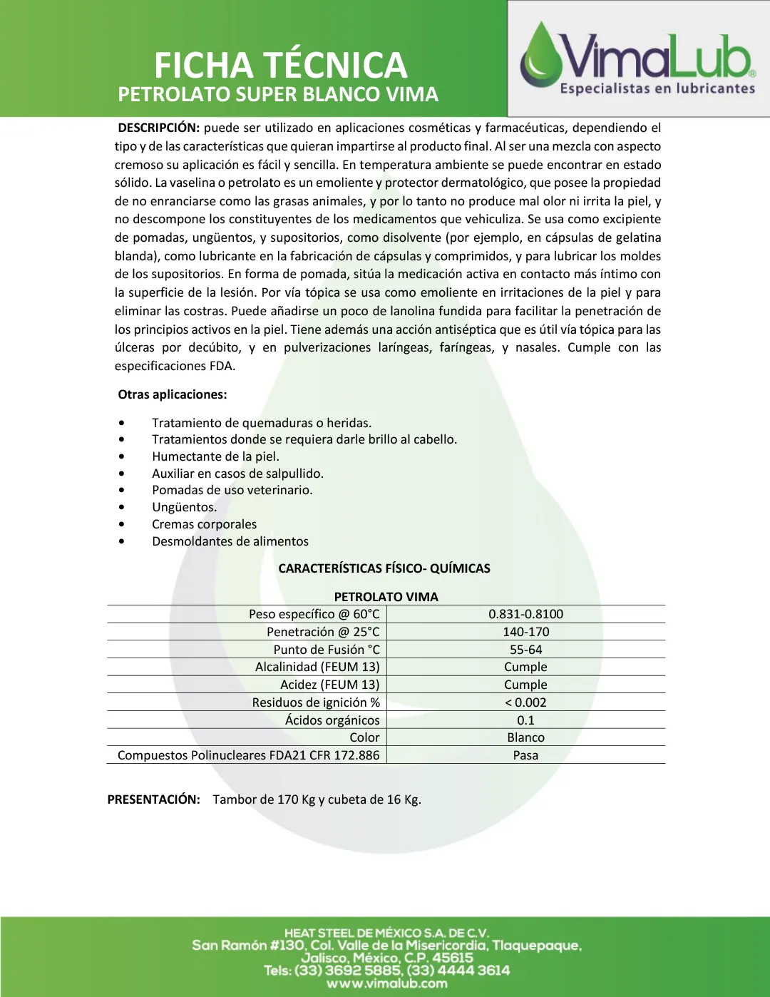 Petrolato Extra Blanco USP de VimaLub también conocido como vaselina pura, especialmente elaborado para aplicaciones industriales, farmacéuticas y cosméticas que requieren un producto de alta pureza y seguridad.